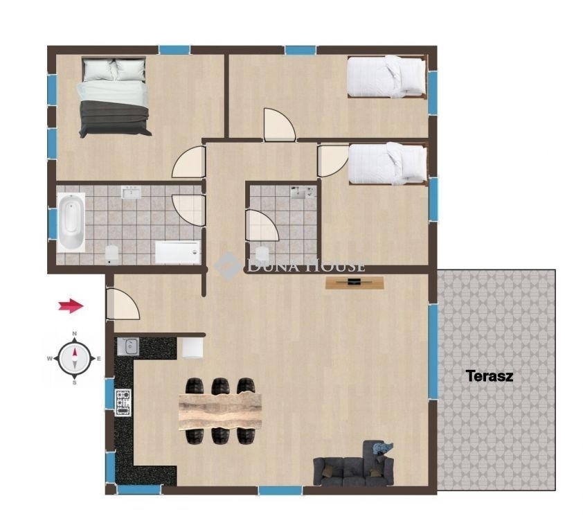 A belső tér világos és élhető: a nappali közvetlen kertkapcsolattal rendelkezik, a fedett terasz pedig tökéletes helyszín a pihenésre vagy családi programokra. A praktikus elrendezésnek köszönhetően a 3 hálószoba mellett gardróbok is helyet kaptak, így a mindennapi élet kényelmesen szervezhető.