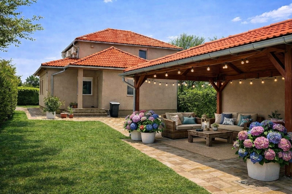 A ház egy összközműves 534 m2-es sík telken fekszik, mögötte a nagyobb egybefüggő kertrész ideális méretű pihenőkert lehet.