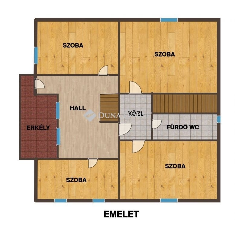 Épületben 4 db külön bejárató szoba, alsó szinten nagy méretű nappali, mind kettő szinten fürdő wc, alsó szinten konyha, hall erkélykapcsolattal, gardrób, kamrák, és közlekedői rész alkotja a hasznos lakrészt.