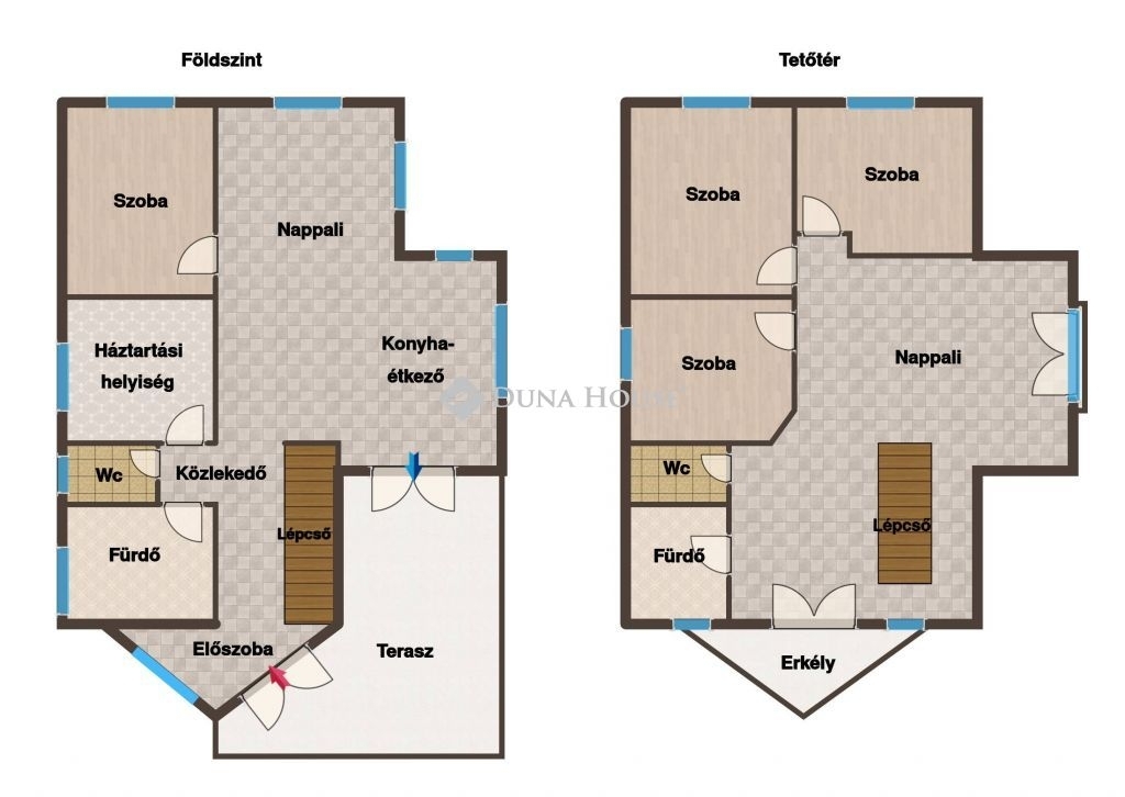 Alsó szint: előszoba közlekedő résszel, fürdőszoba, külön WC mosdóval, konyha-étkező-nappali, szoba, háztartási helyiség.
