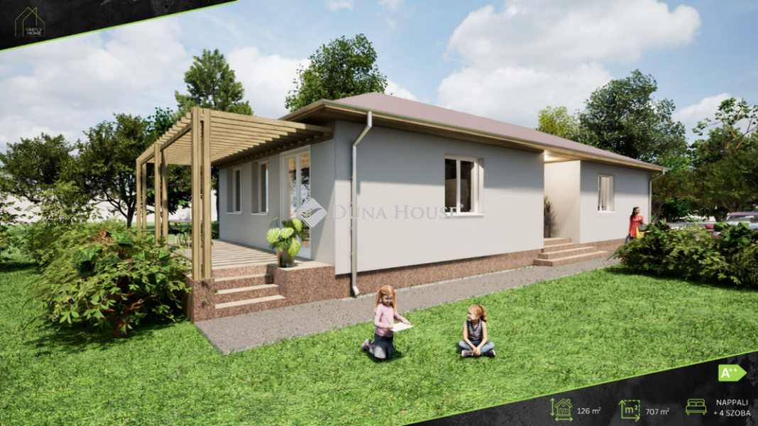 Felsőpakonyban, családias hangulatú szomszédságban kínálunk 126 m2 alapterületű új építésű ingatlant nagyon kedvező áron! A korszerű, könnyűszerkezetes ingatlan 700 m2-es közművesített telekre épül, melyet a kivitelező tereprendezés után, lekerítve ad birtokba. Tágas, pergolás terasz és térkövezett, fedett kocsibeálló is kialakításra kerül.A családiház helyiségeit alább részletezem:Előtér: 3 m2Amerikai konyhás nappali: 30.5 m2Szoba 1: 11 m2Szoba 2: 11.5 m2Szoba 3: 12 m2Szoba 4: 12 m2Fürdőszoba 1: 5.5 m2Fürdőszoba 2: 5.5 m2WC: 1.7 m2Tároló: 5.0 m2Közlekedő : 7.5 m2Terasz: 20 m2A könnyűszerkezetes házak az építkezés jövője. Álmodja meg velünk prémium minőségben kivitelezett otthonát, melyet rövid határidővel, teljes körű kivitelezéssel adunk át a szerződéskötéstől számított 5-7 hónapon belül!A teljes ház 90 cm mély, szigetelt sávalapra épül SIP szerkezettel. A ház elrendezésével kapcsolatban jelenleg még számtalan változtatási lehetőséggel élhet új tulajdonosa. A főfalak és a vizes blokkok kivételével szinte bármelyik helyiség kialakítása történhet az Ön kéréseinek megfelelően, az álomotthon vevői igények alapján személyre szabható és alakítható!Az otthonban a kellemes hőérzetet hőszivattyús fűtési rendszer és korszerű Fan-coil szellőztetés garantálják egész évben. A SIP házak energetikailag is prémium kategóriát képviselnek, melyet a 3 rétegű 7 kamrás nyílászárók és a 30 cm-es Isocell padlás szigetelés is fokoznak. Tőlünk vásárolt korszerű otthona garantáltan alacsony rezsivel fenntartható.A szigeteléshez, festéshez kizárólag magas minőségű anyagok kerülnek felhasználásra.A szobák és a gardrób melegburkolatokat, a nappali, étkező, fürdők, közlekedő és a tároló kerámia, a terasz fagyálló kerámia burkolatot kap, melyet az Ön ízlésének megfelelően választhat a szerződéskötés után.A vételár tartalmaz általunk beépített konyhabútort 2 millió forint értékben!Kérésre extraként igényelhető Smart home rendszer, további kertrendezés, de akár napelem telepítését is vállaljuk megbízható, kiváló referenciákkal rendelkező partnereinkkel.Amennyiben felkeltettem érdeklődését keressen bizalommal további információért!Ingatlan eladás és vétel teljes körű ügyintézése, megbízható ügyvédi háttér biztosítása, ingyenes ingatlan tanácsadás, teljes körű és gyors bankfüggetlen hitelügyintézés, biztosítás, energetikai tanúsítvány akár hozott ingatlanra is az ország piacvezető ingatlanközvetítő hálózatának támogatásával!
