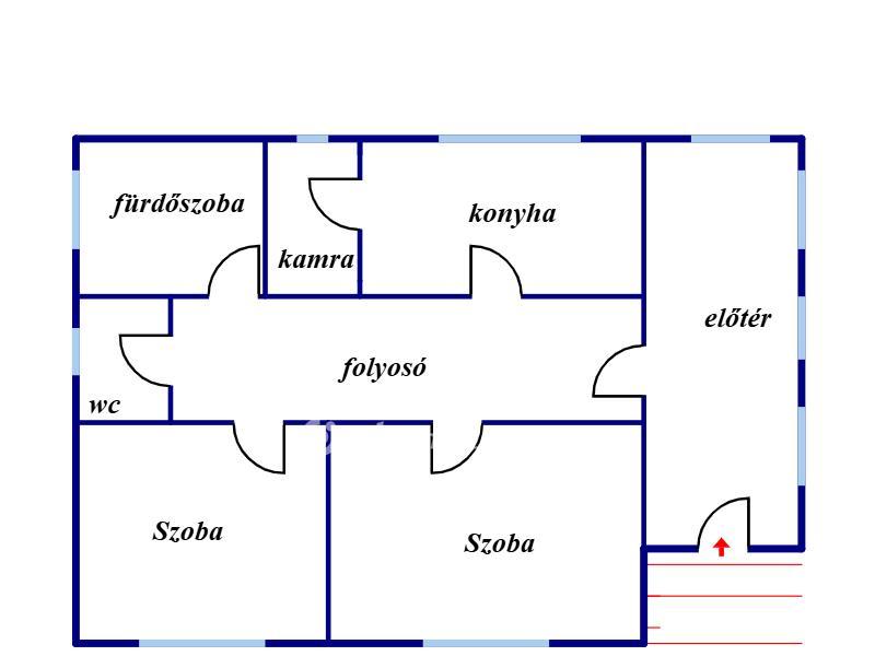 A ház elosztása praktikus: 2 szoba, nagy előtér, konyha kamrával, valamint külön WC és fürdőszoba található benne. A fürdőszobában zuhanyzó van, a meleg vizet 100 literes villanybojler biztosítja.