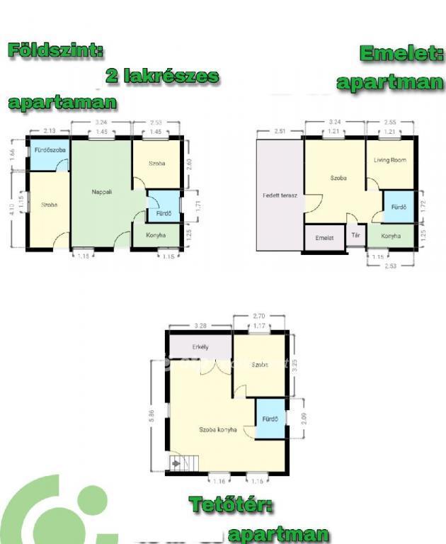 A középső szinten található egy 1,5 szobás lakás - nappali, szoba, fürdőszoba, konyha, tároló elosztással, külön bejárattal, saját terasszal.