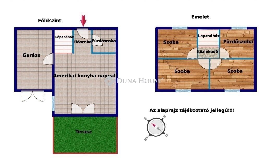 A lakrészek a földszinten csak a garázsnál az emeleten pedig a fürdőszobánál és az egyik szobánál érnek össze.