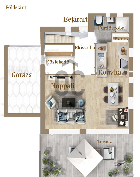 Az alsó szinten található egy 30 m²-es terasz, ahol kora tavasztól késő őszig élvezhetjük a kertkapcsolatot.
