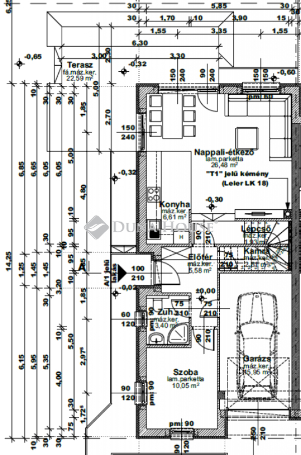 Földszint:- tágas, világos amerikai konyhás nappali étkezővel, terasz- és kertkapcsolattal,- délkeleti fekvésű hálószoba,- zuhanyzós fürdőszoba és mellékhelyiség,- praktikus kamra,- 16 m²-es garázs, ahonnan közvetlenül a házba léphet.