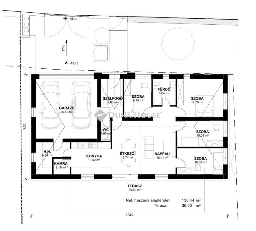 Az udvarra belépve a szemet az utcafronti 3D kerítés, a térkövezett gyalogos és gépkocsi bejáró fogja meg. A gépkocsitárolásról szekcionált garázskapuval ellátott garázs gondoskodik, az elektromos nagykapu tovább növeli a kényelmet. Otthona környezete nemcsak szép, de biztonságos is, köszönhetően a megbízható kivitelezésnek és az elővigyázatosan megtervezett építési anyagoknak, mint a 30 cm vastag Porfix falak, a 15 cm vastag EPS hőszigetelés és a 30 cm vastag üveggyapot tetőhőszigetelés.