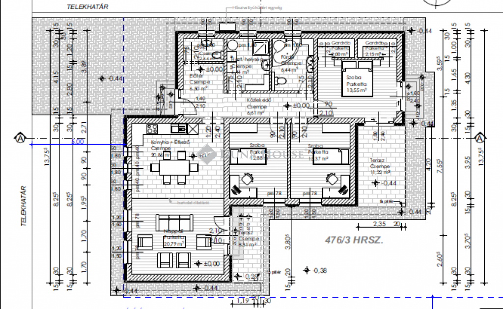 Tágas nappali, 4 külön nyíló szoba, ((amerikai konyha-nappali-étkező + 3 hálószoba), 2 gardrób, nagy előszoba, kertkapcsolatos terasz, letisztult modern építészeti megoldások, parkosított kert lehetőségével.