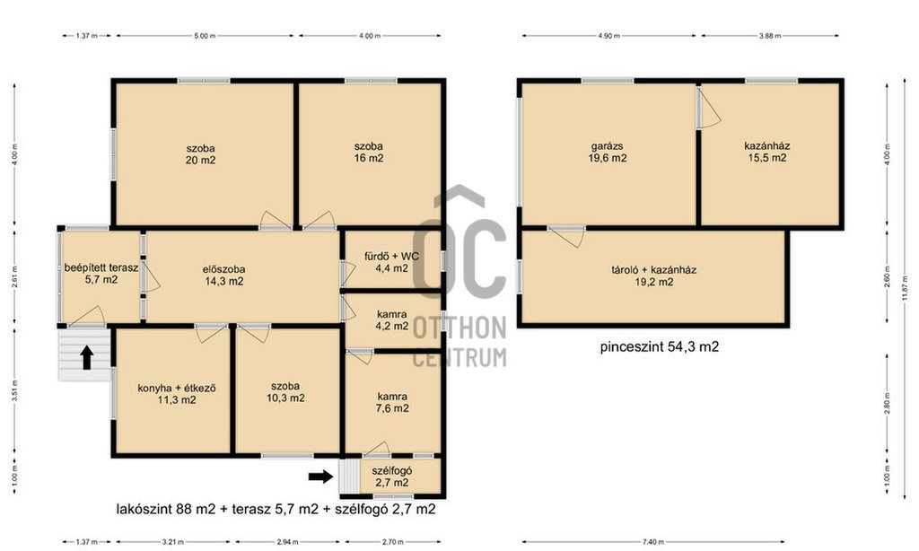 - A ház alatt nagy méretű alagsor épült, amely 54,3 m2-es.