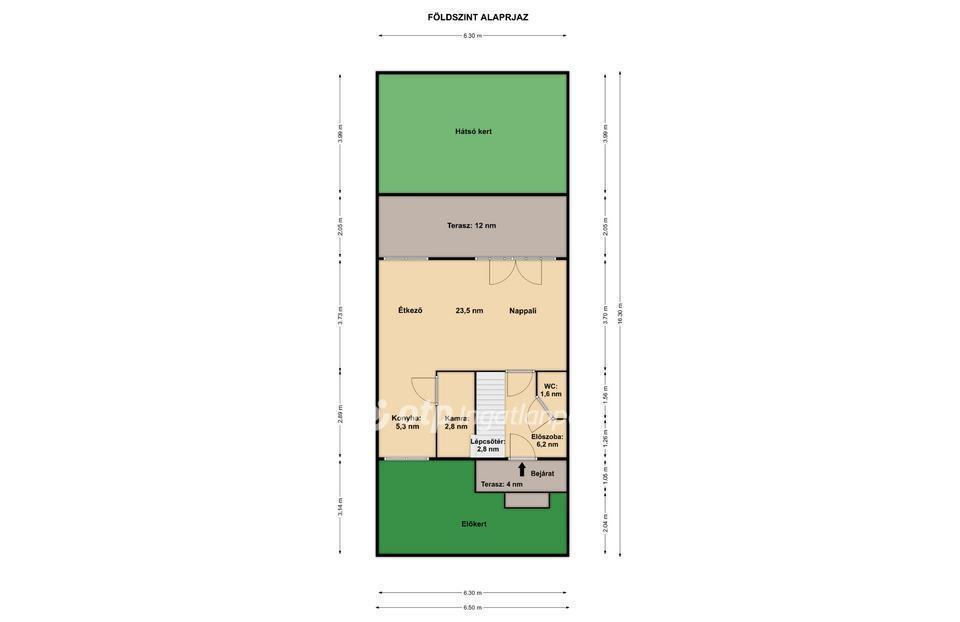 Földszint: előszoba, WC+kézmosó, tágas amerikai konyhás nappali étkezővel, kamra