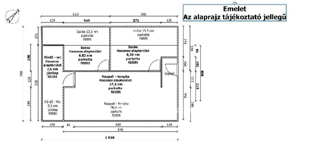 Az emelet tetőtér beépítésű, itt 40 nm-en 2 szoba, világos, amerikai konyhás nappali, valamint fürdőszoba WC-vel került kialakításra.