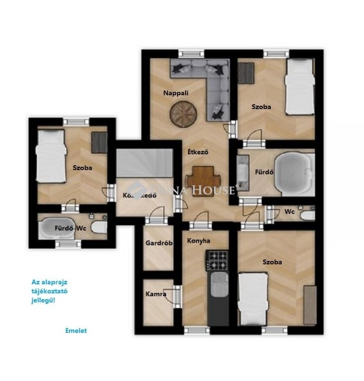 előtér, fürdő WC-vel, kamra, konyha, nappali, 3 hálószoba