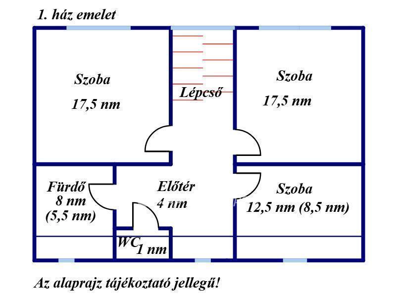 Az emeletre érve mindkét oldalon egy 17,5 nm-es szoba fogad bennünket. Picit beljebb lépve a 4 nm-es előtérben, megtalálható még egy 8,5 nm-es szoba, egy különálló WC, illetve egy káddal ellátott 5,5 nm-es fürdőszoba. Az emeleten a kellemes hőérzetért egy hűtő-fűtő klíma felel.