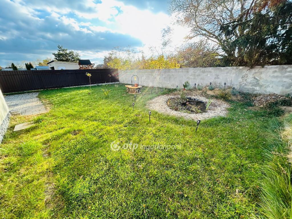 A telek rendezett, elő és oldalkertje térkővel burkolt, hátul füvesítve, melyen található egy kerti tó!