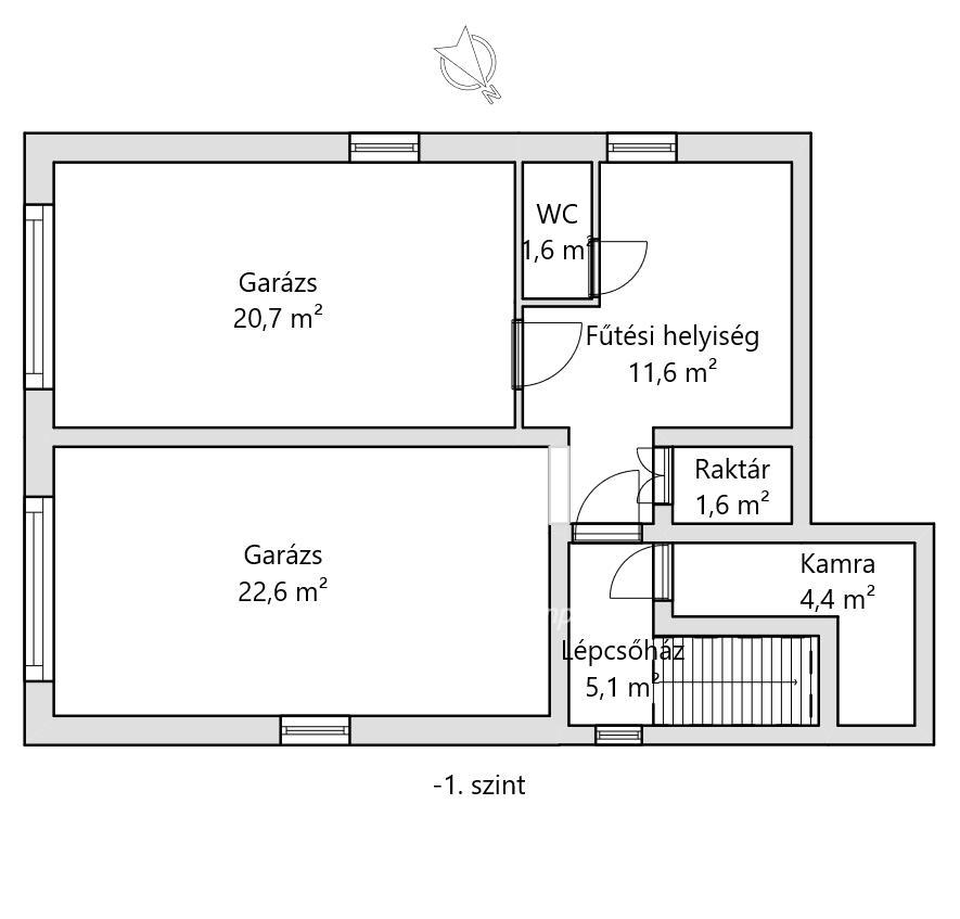 - Pinceszint: 2 garázs, kazánház, hűvös tároló, raktár és mosdó