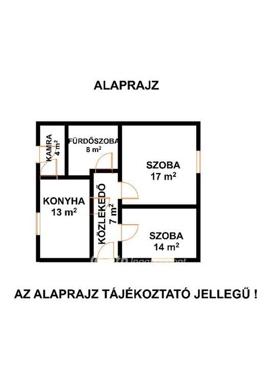 A ház elosztása praktikus: két szoba (17 m2 és 14 m2), 13 m2-es konyha kamrával, 8 m2-es fürdőszoba és 7 m-es közlekedő biztosítja a kényelmes életteret.