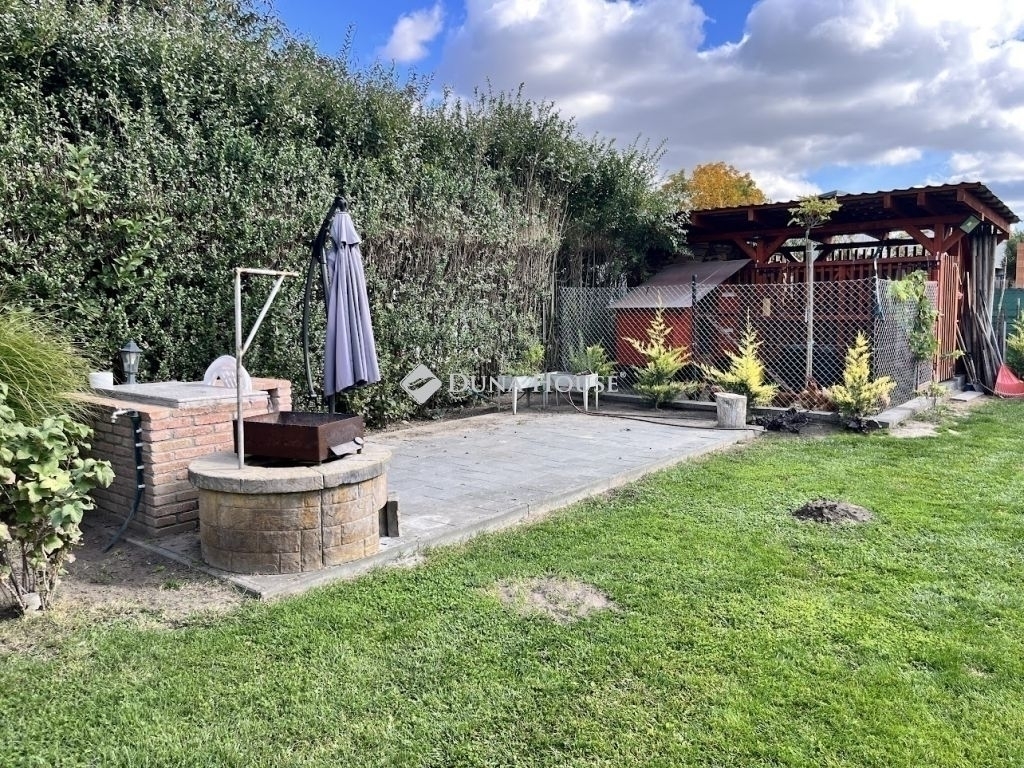 Gondosan ápolt, igényes kert dísznövényekkel, automata öntözőrendszerrel (fúrt kútról működik)