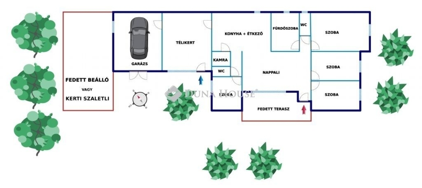 dupla, kétállásos garázs, közvetlen kapcsolattal a télikerthez
