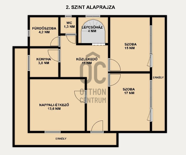 - 2. szint: 2 szoba, nappali, konyha, fürdőszoba, WC, erkély összesen 70 nm hasznos alapterületű
