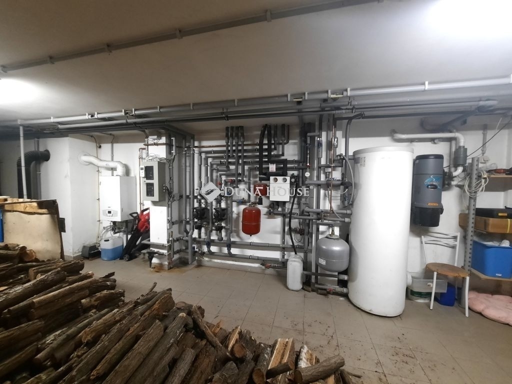 A ház alatt kialakított pincében található a kazánház. A fűtést kondenzációs gázkazán és faelgázosító kazán működteti padlófűtéssel és radiátorokon keresztül. A megújuló energiát hasznosító rendszerek (napelem és napkollektor) és a többlépcsős fűtési megoldások hosszú távon is biztonságos és költséghatékony működést garantálnak.
