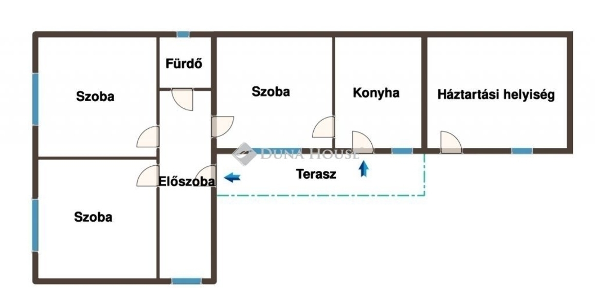 Belépés után az előszobában találjuk magunkat, ahonnan balra rögtön nyílik a két 18 nm-es utcai hálószoba, a bejárattal szemben a fürdőszoba helyezkedik el, jobbra pedig a kisebbik hálószoba, majd az étkezős konyha található. Innen is be tudunk jutni a házba, így akár ez is külön szeparálható.