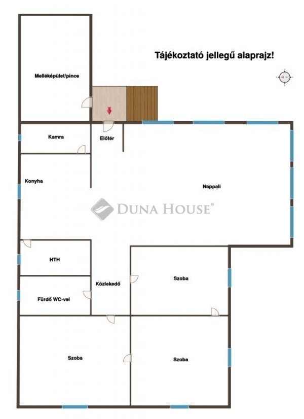 A ház belső elrendezése átgondolt: három szoba, fürdőszoba WC-vel, konyha, kamra, háztartási helyiség, valamint egy tágas, mintegy 40 négyzetméteres nappali kapott benne helyet. Két szoba félig kész állapotban van, így az új tulajdonos saját ízlése szerint fejezheti be őket. Az épület betonalapra épült, vegyes falazattal, fafödémes szerkezetű, és a ház alatt pince is található.