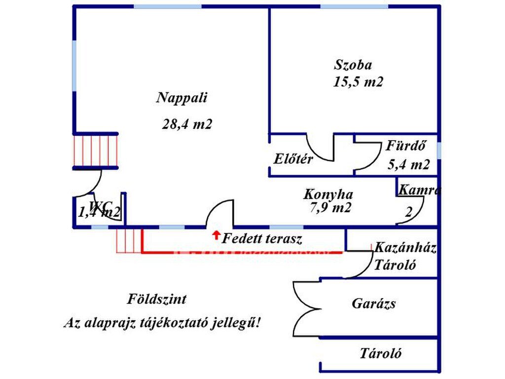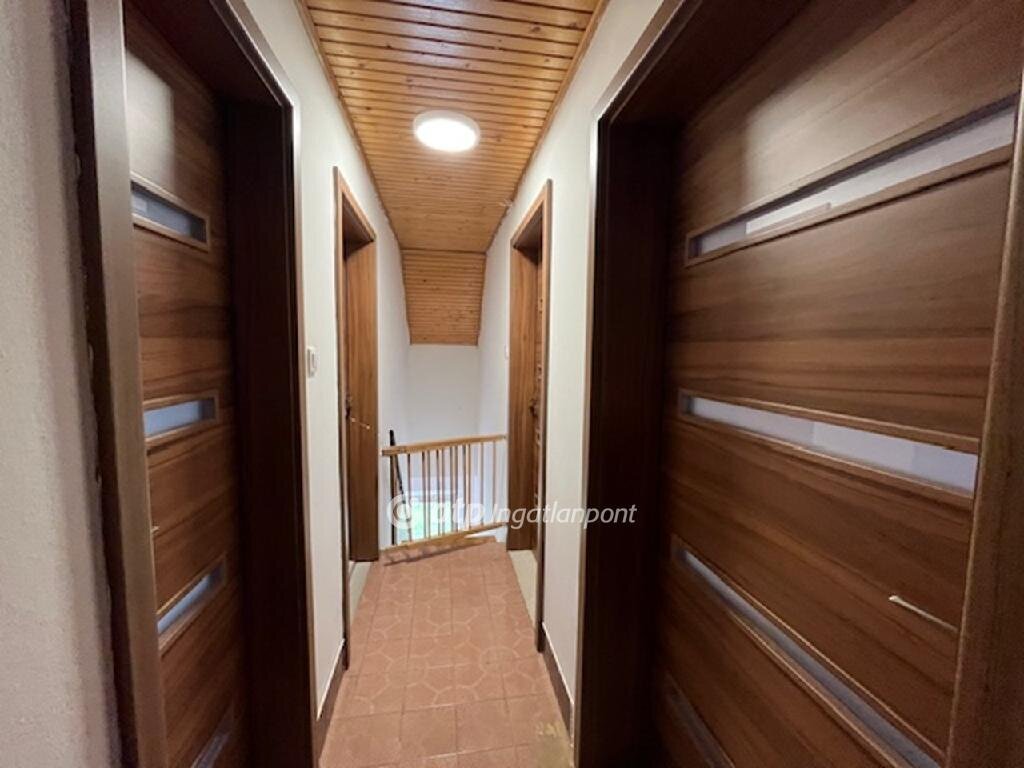 A földszinten 2 szoba, nappali, konyha, fürdőszoba, külön wc, fedett terasz, kazánház, tároló található.