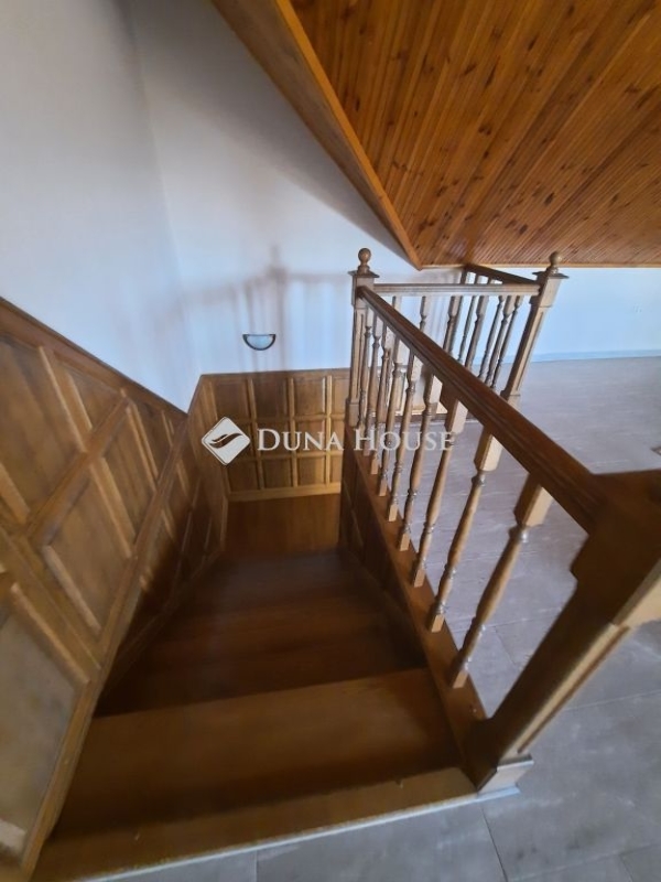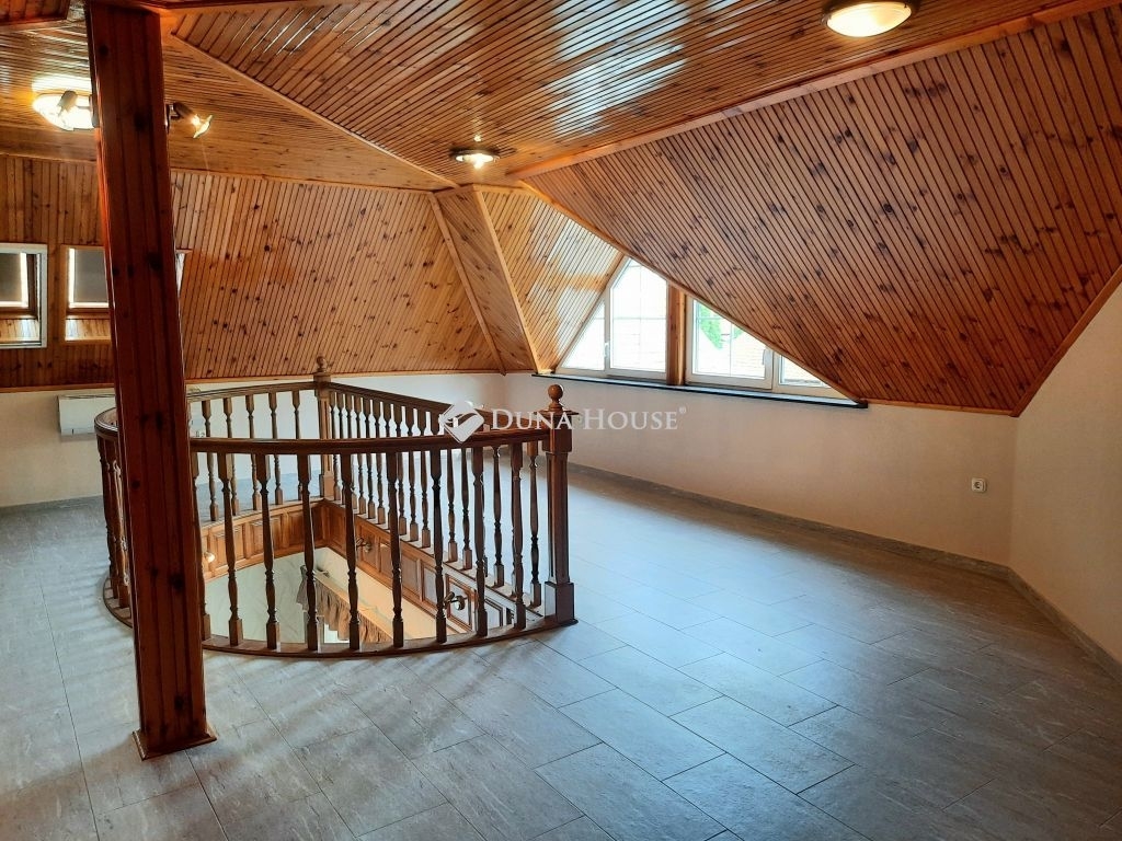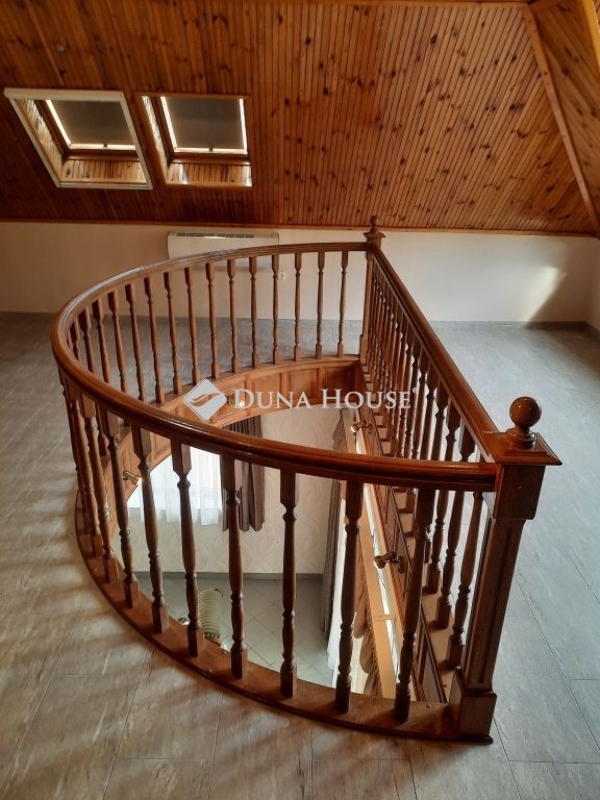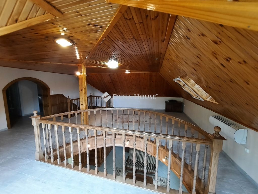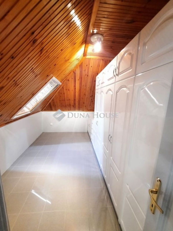 A tetőtérbe egy gyönyörű parkettás, minőségi lambériával burkolt tetőtérbe jutunk, ami tágas emeleti nappaliként funkcionált, és további 2 szobát alakítottak ki egy emeleti tágas fürdőszobával kiegészítve.