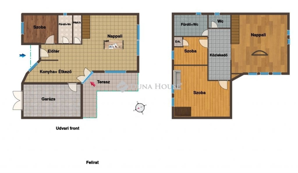 Az épület tájolását tekintve ideális dél - dél nyugat fekvésű, a telek mérete kicsivel több mint 1000 m2 , de a 2 épület méretét tekintve nem is tűnik olyan nagynak.