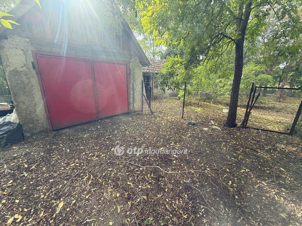 Különálló garázs és melléképület, körbekerített udvar, fák és kisebb erdős rész.