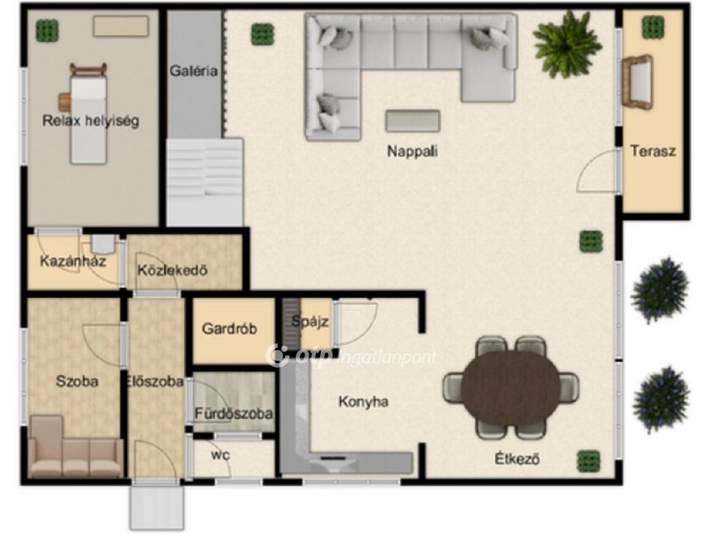 -a földszinti beltérben: előszoba , 2 szoba , amerikai konyhás nappali , spájz , közlekedő , fürdőszoba külön wc , kazánház , és terasz került kialakításra