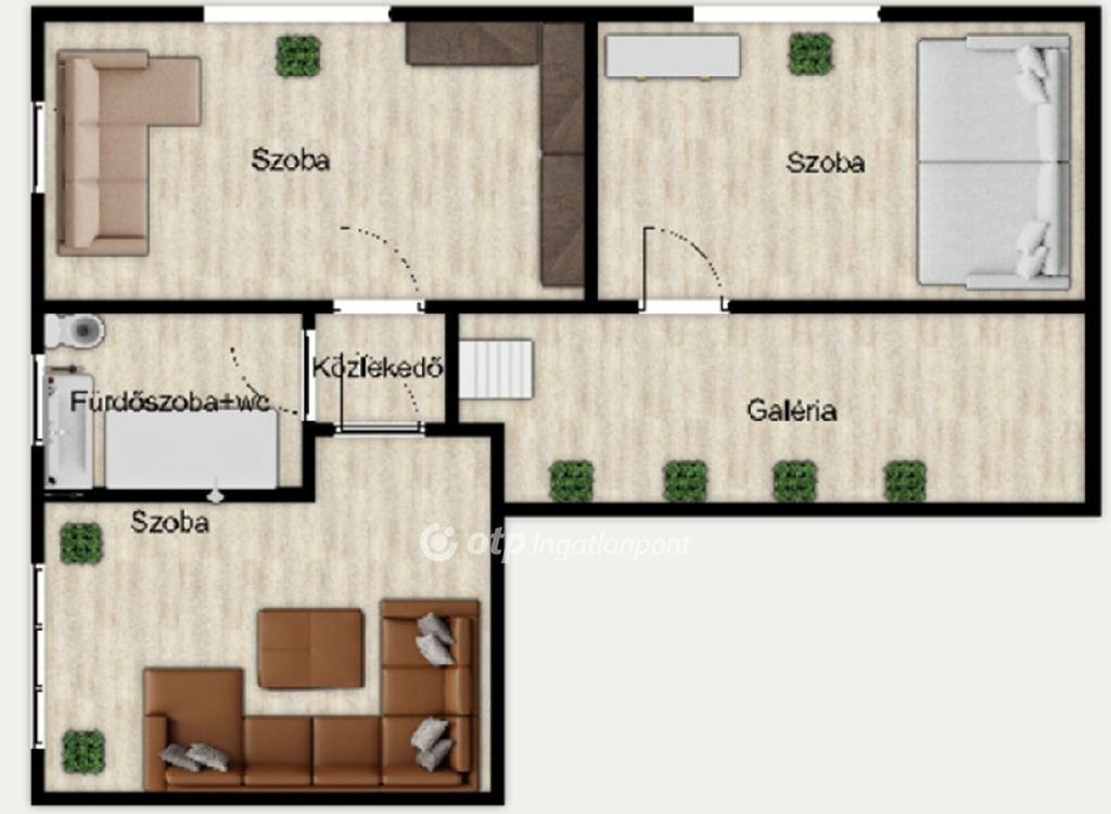 -az emeleti részben: előtér , 3 szoba . közlekedő , fürdőszoba+wc kapott helyet.