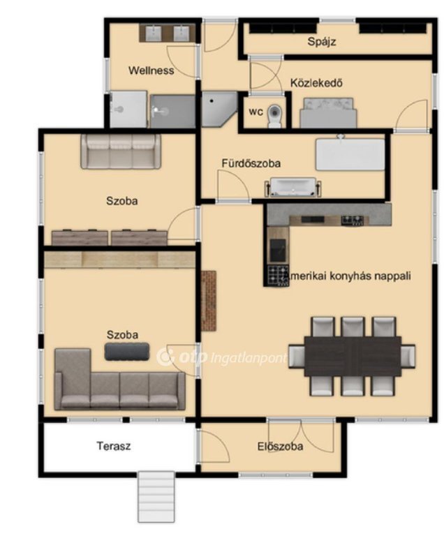 -a világos belső helyiségben : előszoba , 2 szoba +1/2 szoba , amerikai konyhás nappali , fürdőszoba külön wc , közlekedő , spájz került kialakításra.