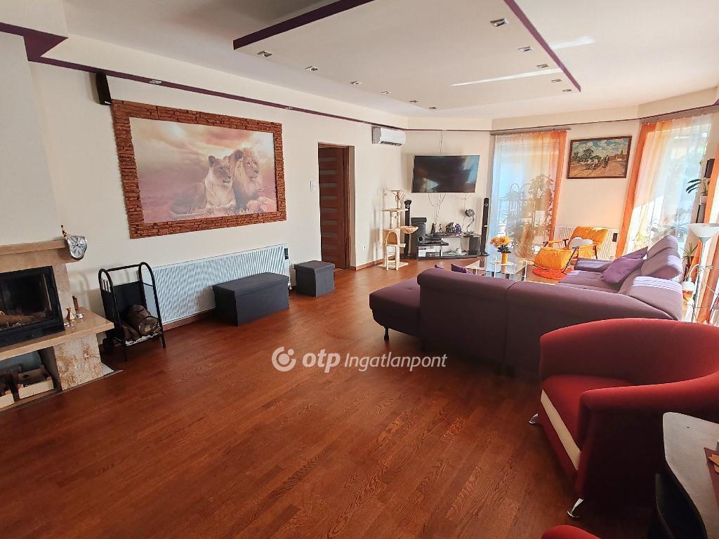 A ház lakószintből és szuterénszintből áll. A felső szinten három hálószoba, két fürdőszoba, gardrób, kamra és egy tágas, napfényes amerikai konyhás nappali található, amely közvetlen kapcsolatban áll a körbefutó teraszokkal és a gondozott kerttel. A teraszokról szép kilátás nyílik a kerti tóra és a zöld környezetre.