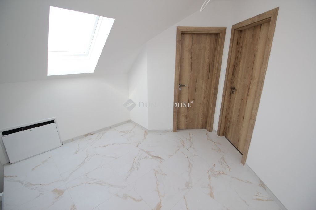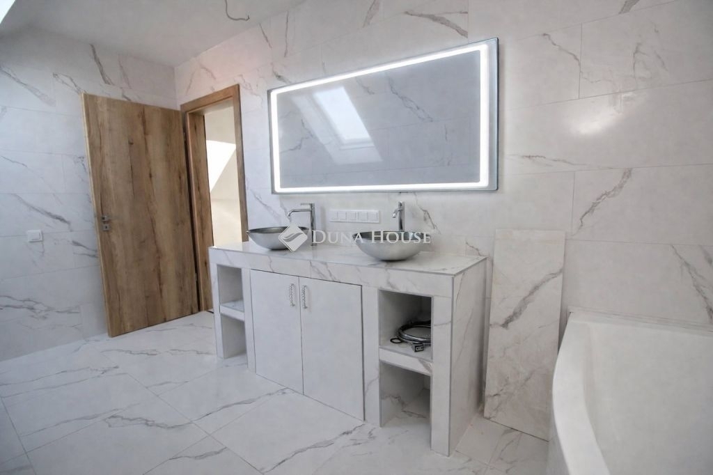 A földszinten egy tágas, világos amerikai konyha+nappali került kialakításra, valamint egy különleges adottságú, igényesen kialakított fürdőszoba található a földszinti hálószoba mellett. A prémium minőségű, egyedi tervezésű konyha teljesen felszerelt, a beépített gépekkel együtt a vételár részét képezi. Az emeleten kettő hálószoba,gardrób és egy impozáns méretű fürdőszoba kapott helyet.