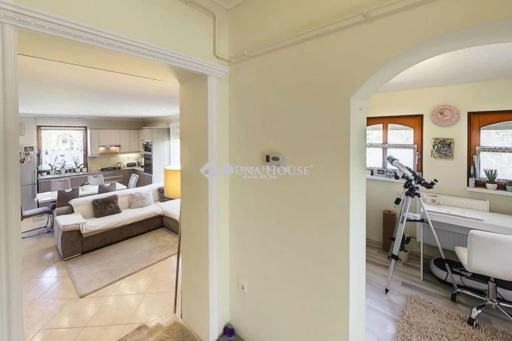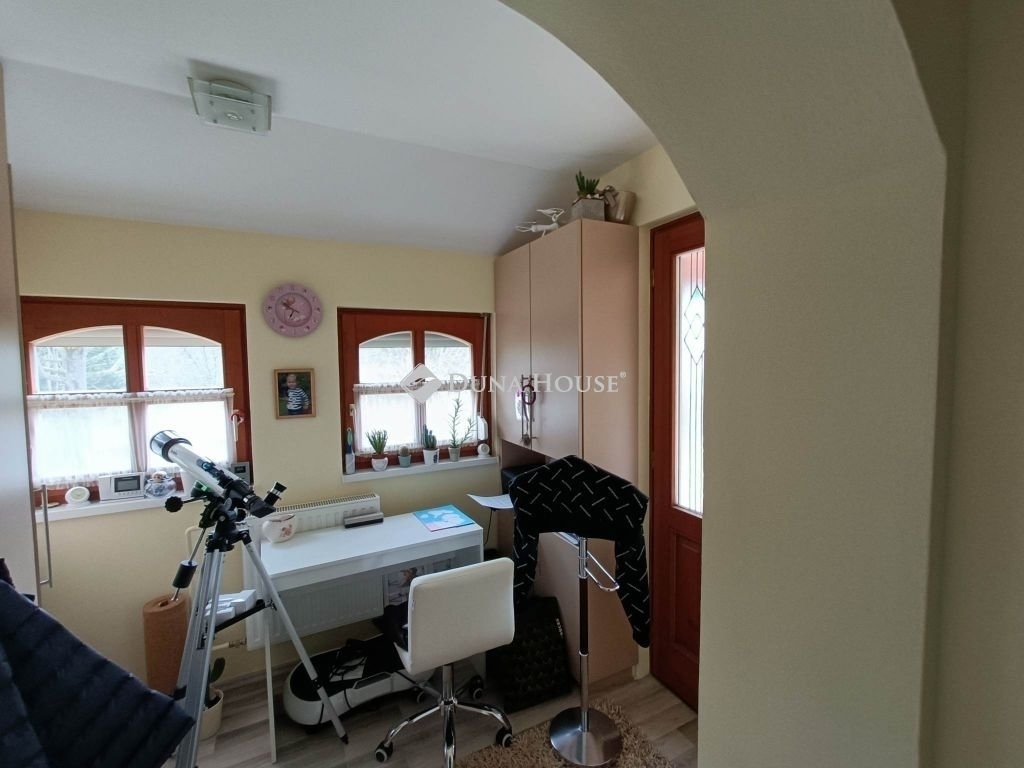 Némi szintkülönbséggel található egy kisebb szoba, gardróbszoba, valamint fürdőszoba (1 éve felújítva) , ezáltal akár teljesen el lehet szeparálódni a társassági lakótértől. A lakrész nagyon hangulatos és világos, nappalijából kijárat nyílik a szép parkosított kertjébe.