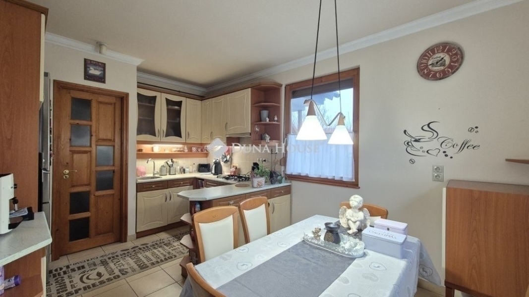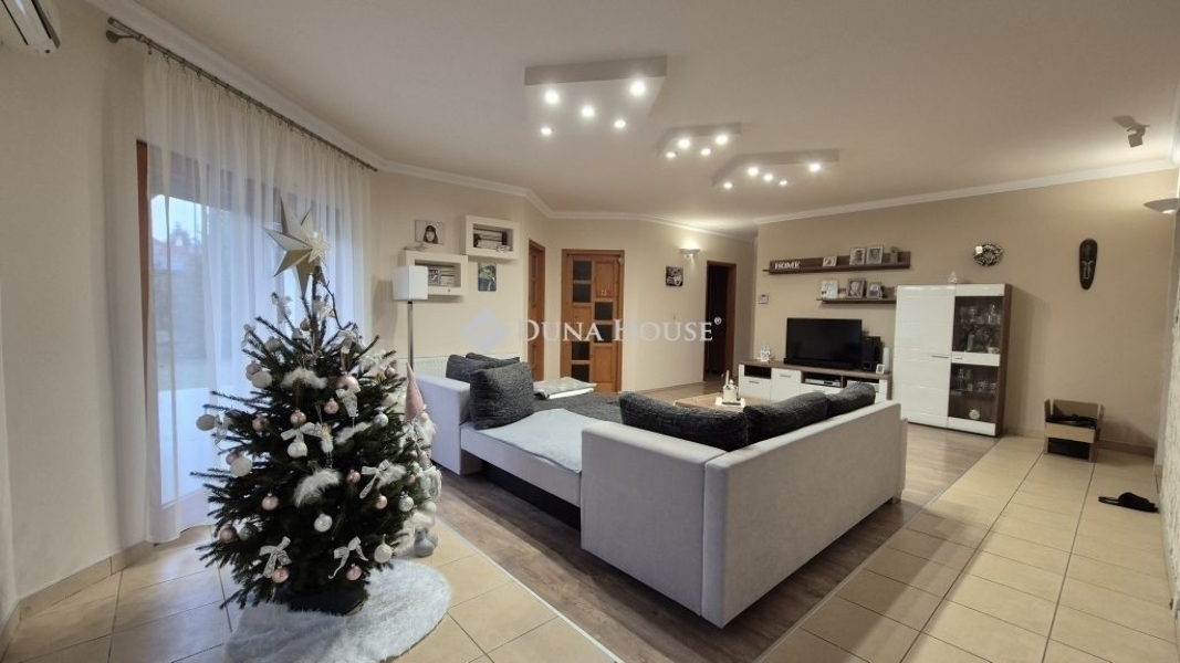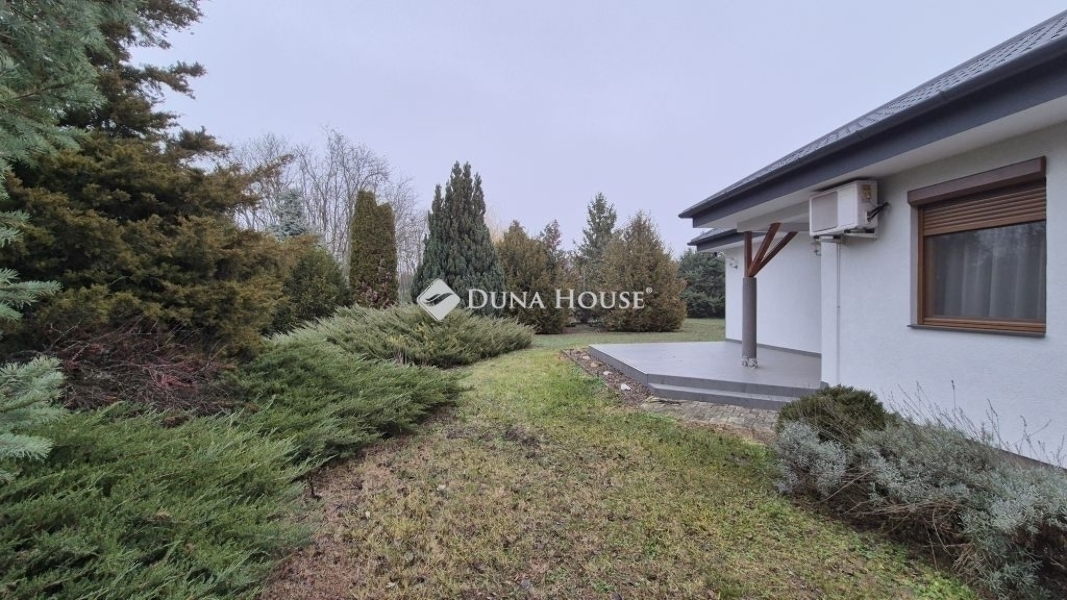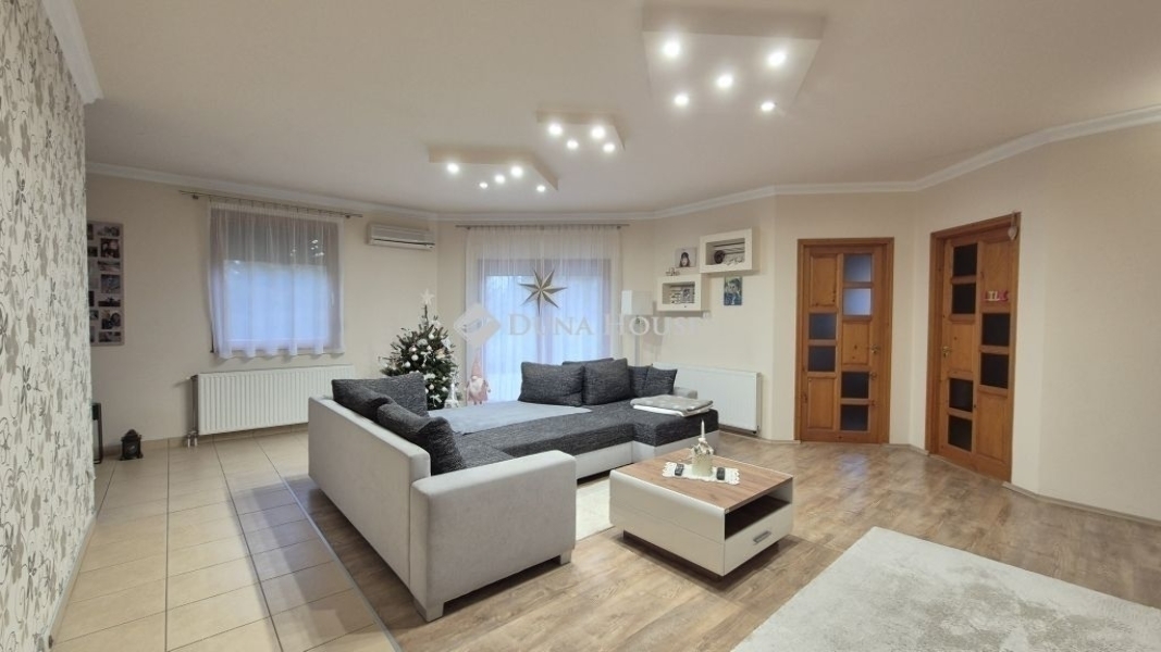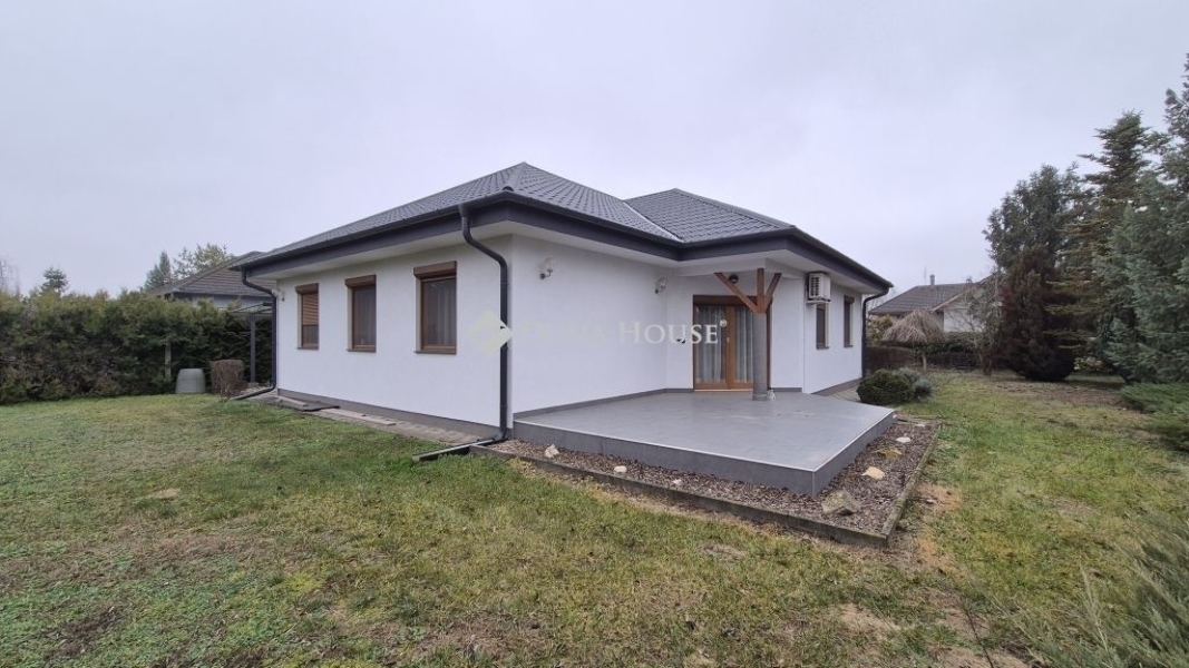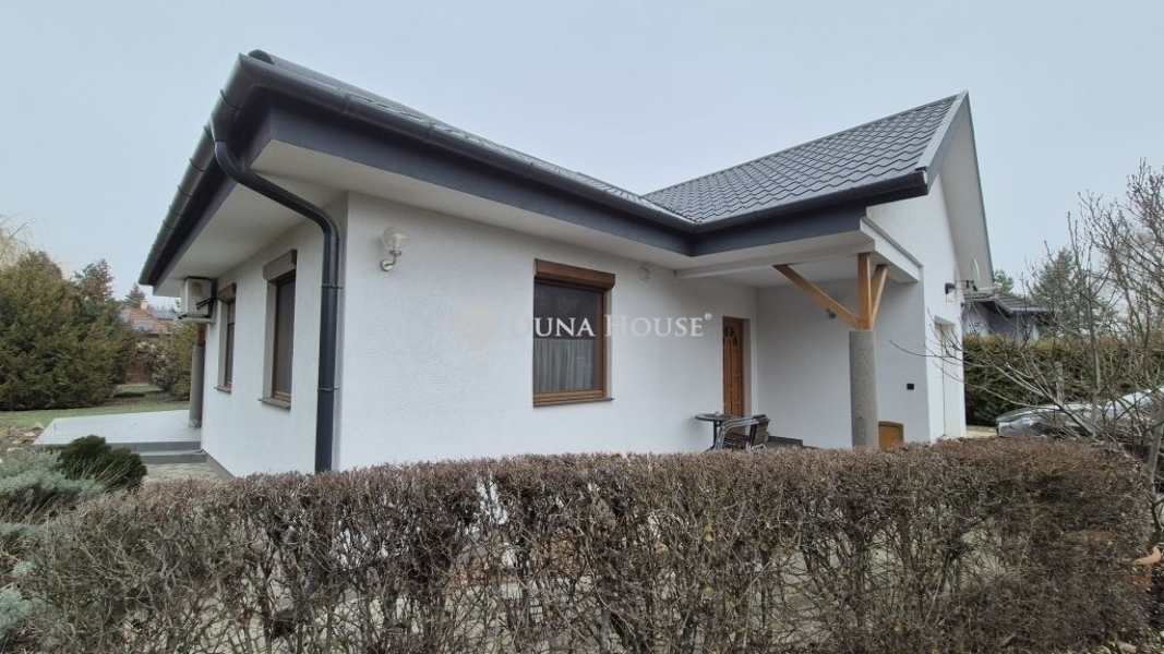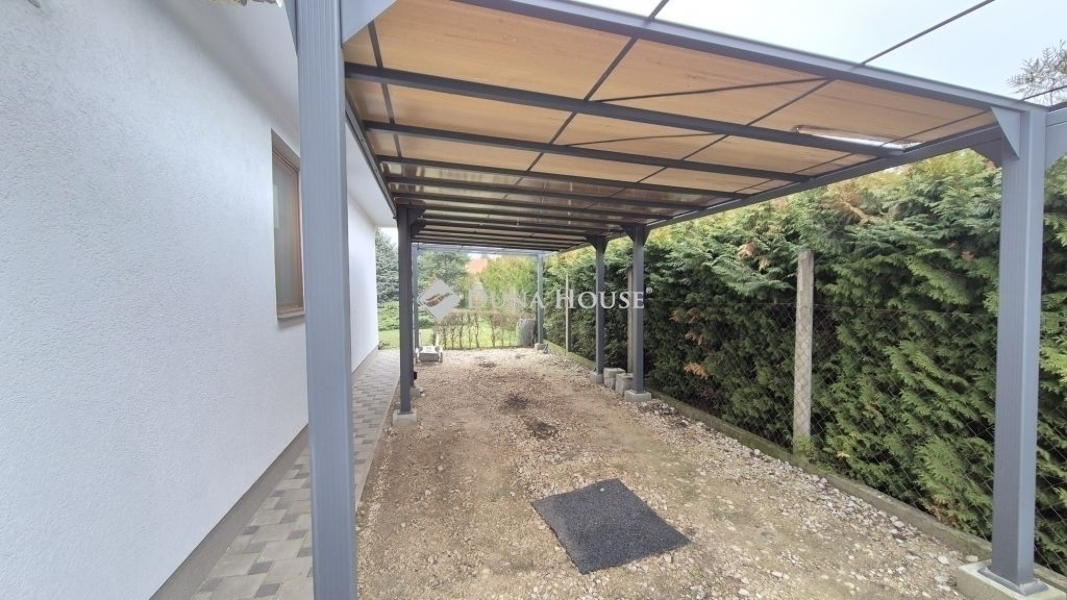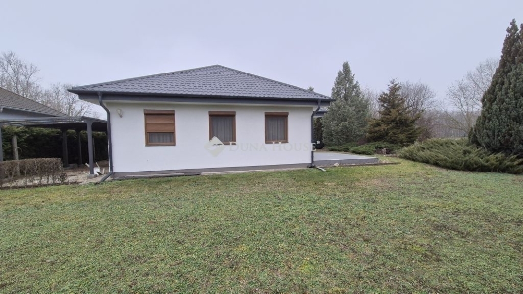 Eladó Kecskemét Budai hegyben 137 nm-es családi ház, parkosított 3422 nm telken, garázzsal, plussz két autónak fedett kocsibeállóval. A lakótér 97 nm, garázs 20 nm és a terasz 21 nm.