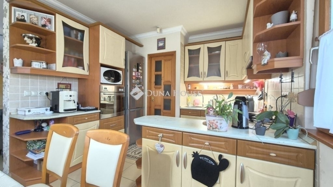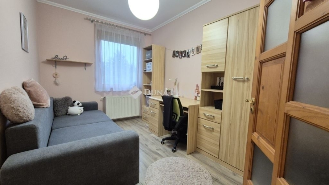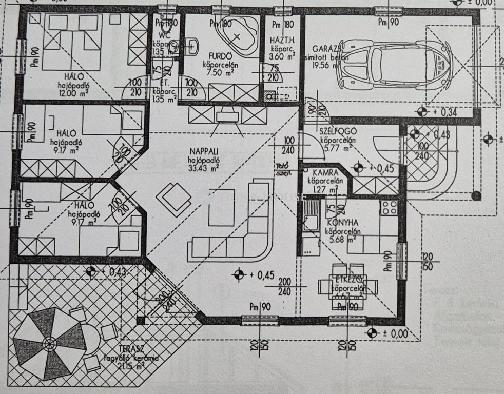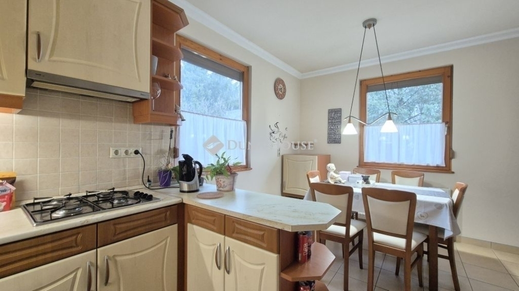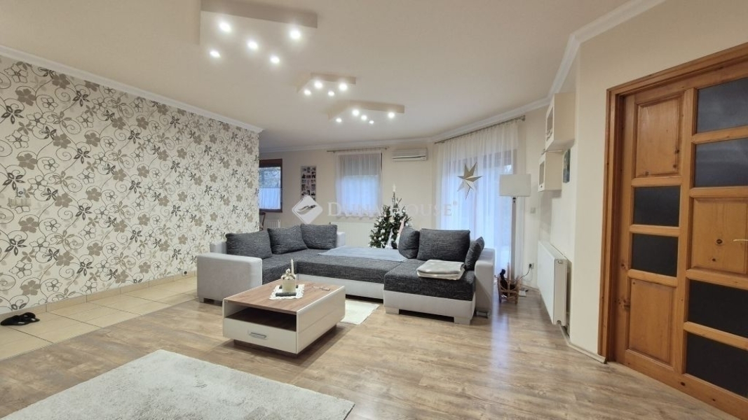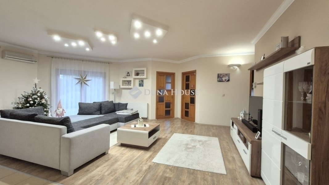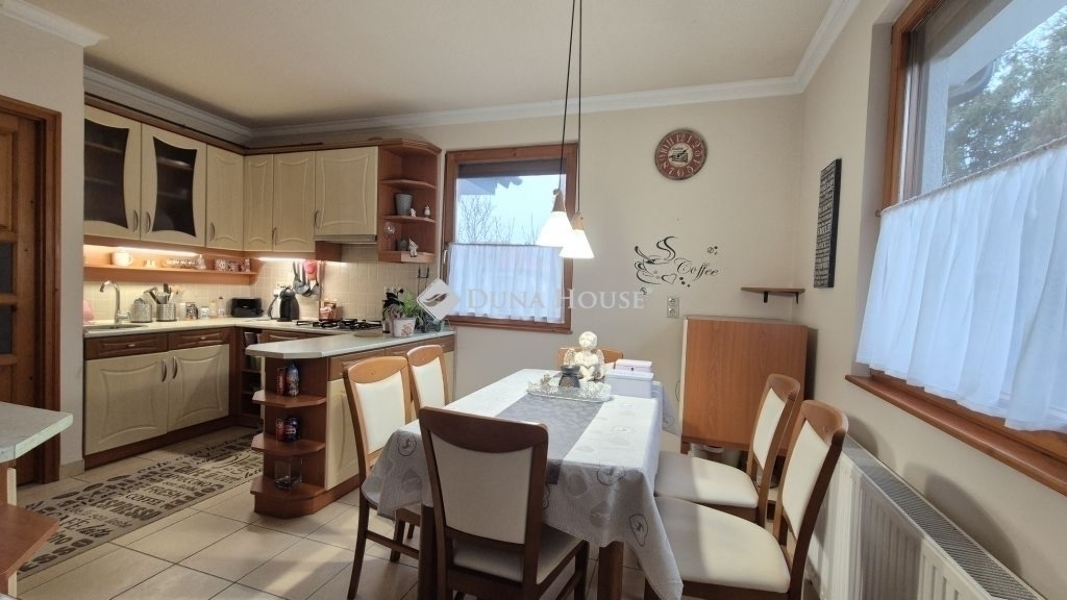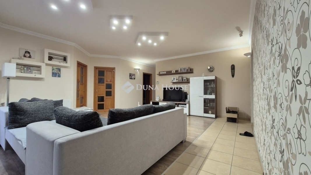Eladó Kecskemét Budai hegyben 137 nm-es családi ház, parkosított 3422 nm telken, garázzsal, plussz két autónak fedett kocsibeállóval. A lakótér 97 nm, garázs 20 nm és a terasz 21 nm.