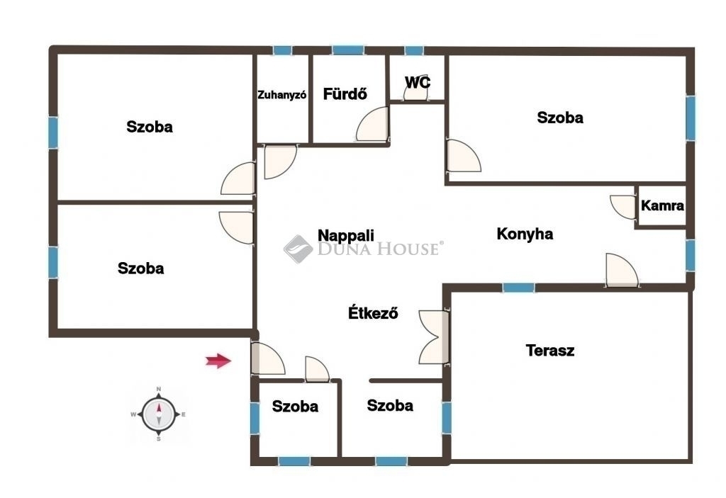 Az ingatlan jelenlegi kialakítása nappali + 5 szoba. A nappaliból két kisebb szoba került leválasztásra gipszkarton falakkal, amelyek igény esetén könnyedén visszabonthatók, így az eredeti, tágas nappali tér egyszerűen visszaállítható.