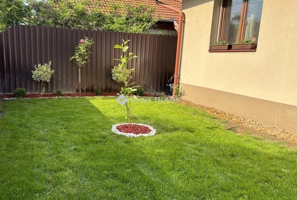 A házhoz tartozó parkosított kert automata öntözőrendszerrel ellátott, így a zöld környezet fenntartása egyszerű és kényelmes.