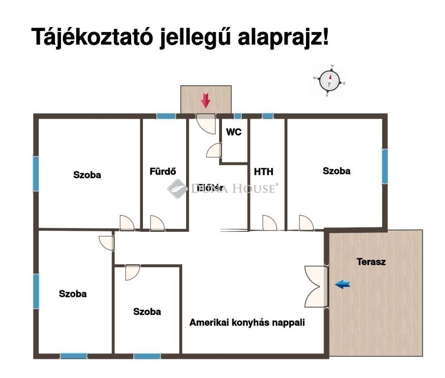 Az ingatlan 103 négyzetméter hasznos alapterülettel rendelkezik, saját 536 négyzetméteres kerttel. Az elrendezés négy hálószobát, egy amerikai konyhás nappalit teraszkapcsolattal, egy fürdőszobát, külön WC-t és egy háztartási helyiséget tartalmaz.