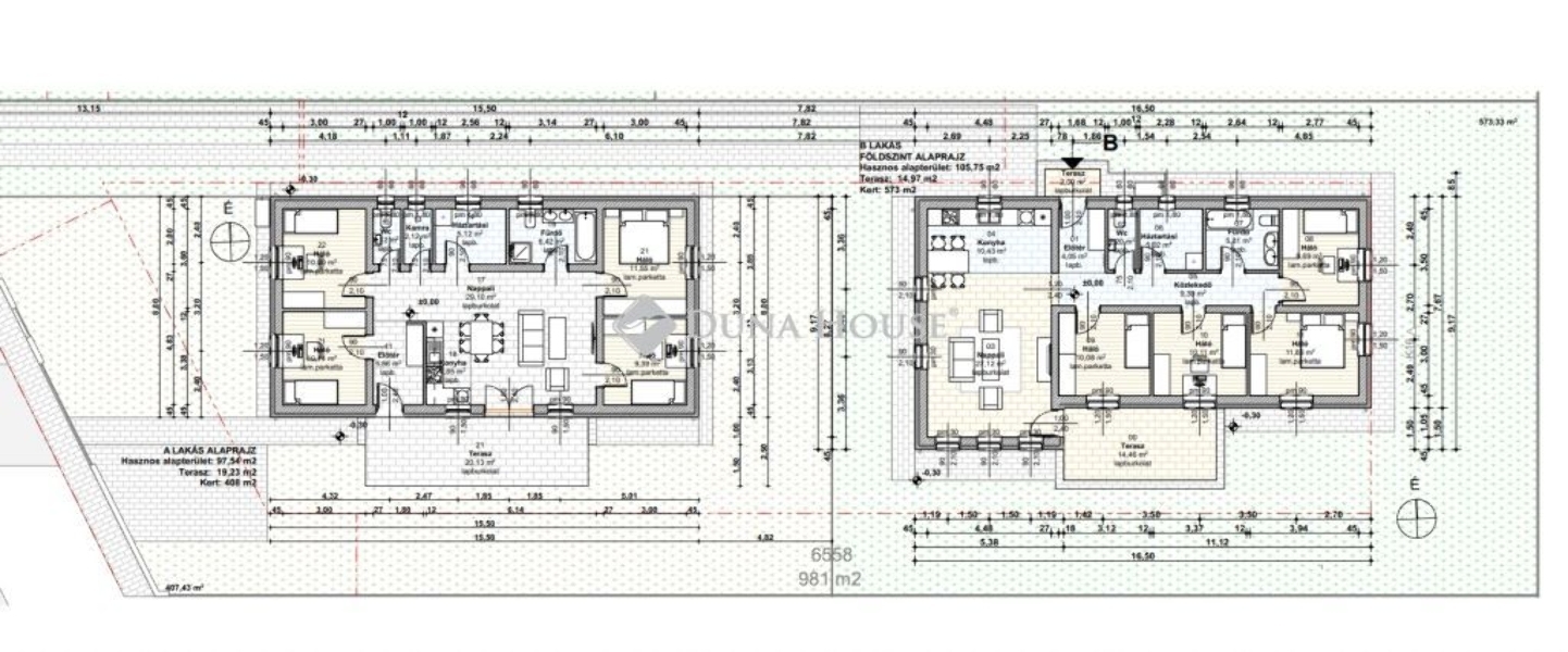 Eladó egy újépítésű ikerházfél Kiskunlacházán! Az ikerházfelek teljesen különállóak, nincs közös fal, garázs vagy tároló, így a ház szinte olyan, mintha önálló családi ház lenne. Az ingatlan 97 négyzetméter hasznos alapterülettel rendelkezik, saját 408 négyzetméteres kerttel. Az elrendezés négy hálószobát, egy amerikai konyhás nappalit teraszkapcsolattal, egy fürdőszobát, külön WC-t és egy háztartási helyiséget tartalmaz. Az épület beton alapra épül, 30-as Leier falazó téglából, 10 cm-es hungarocell szigeteléssel, faszerkezetű födémmel, mely 20cm kőzetgyapot szigetelést fog kapni. A fűtés és meleg víz-ellátás hőszivattyús rendszerrel működik padlófűtésen keresztül, a fürdőben törölközőszárítóval. Az utcafronton betonelemes kerítés készül, a telek körbe lesz kerítve, és a két ikerházrészt elválasztó kerítés is kiépítésre kerül. Az ár tartalmazza a tereprendezést és a fehér színű külső homlokzatot is. Az ár az alábbiakat tartalmazza:-Belső nyílászárók: 40.000 Ft/db áron-Melegburkolatok: 3.500 Ft/㎡ árkategóriában-Hidegburkolatok: 4.000 Ft/㎡ áron-Szaniterek: 20.000 Ft értékben-Fürdőkád: 30.000 Ft-os kerettel.