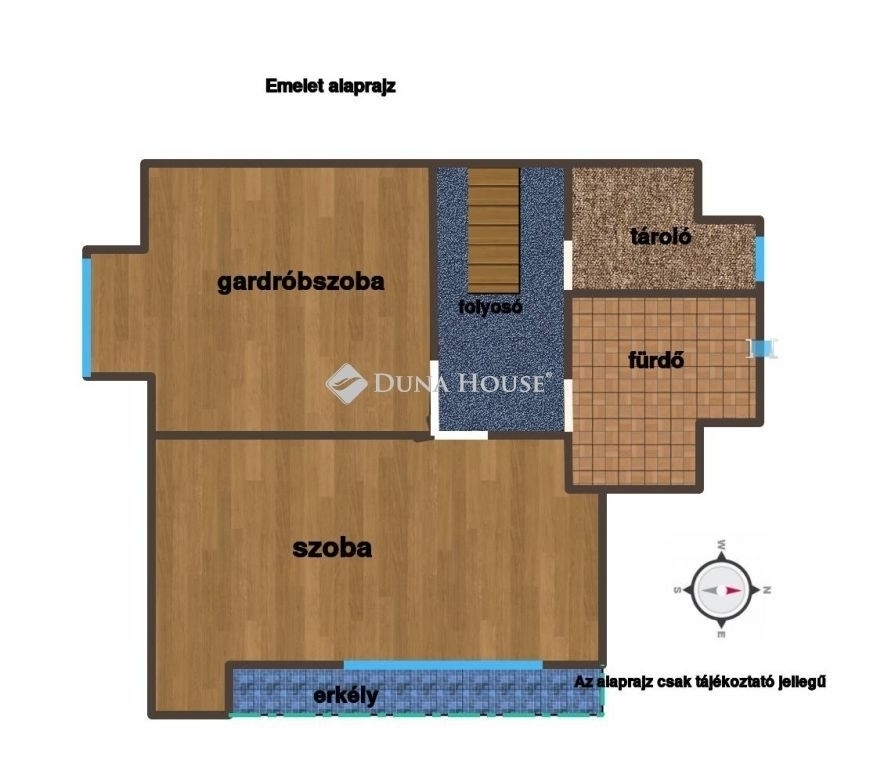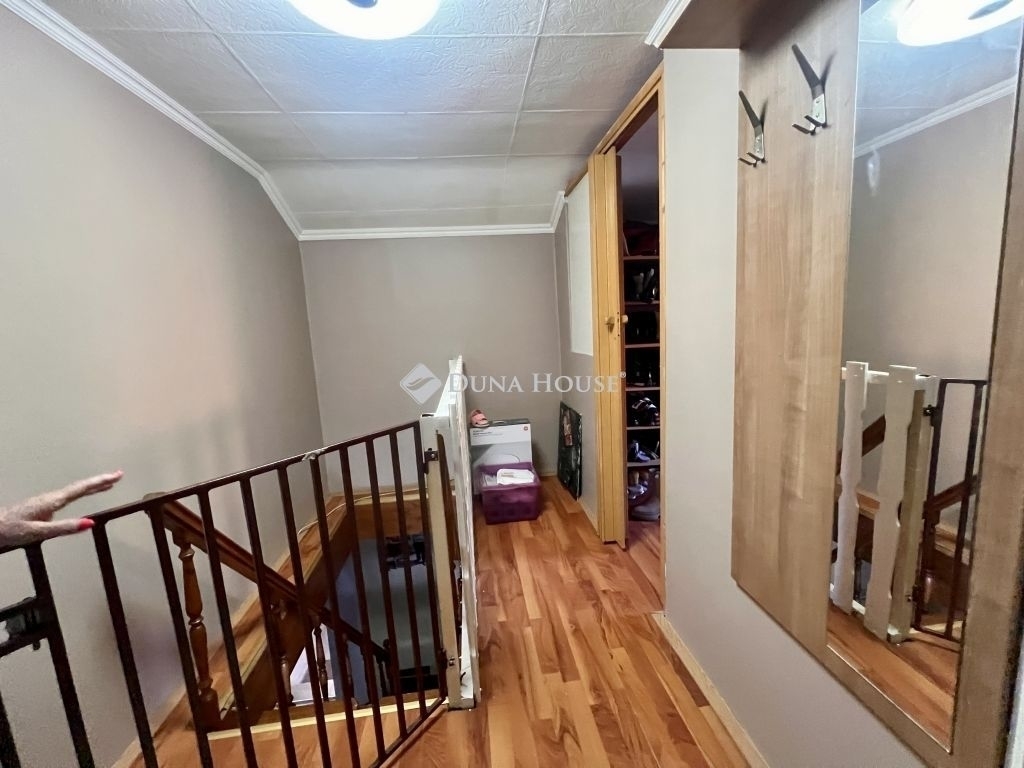 Az emeletre szép, egyedi fa lépcső vezet fel, a tetőtérben pedig hangulatos, erkélyes szoba biztosítja a pihenésre alkalmas teret. A felső szinten is van külön fürdőszoba,zuhanykabinnal, WC-vel.