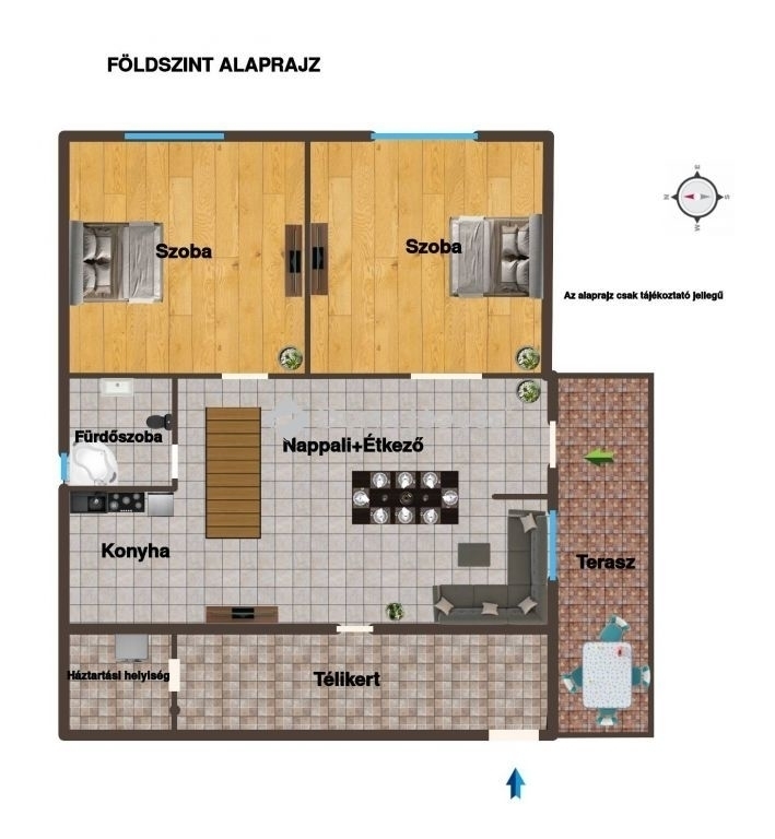 A földszinten 2 tágas szoba, és egy óriási konyha- étkező- nappali található. A két külön nyíló szoba minőségi új beltéri fa ajtót kapott. A felújított fürdőszobában sarokkád, WC, mosdó kapott helyet.