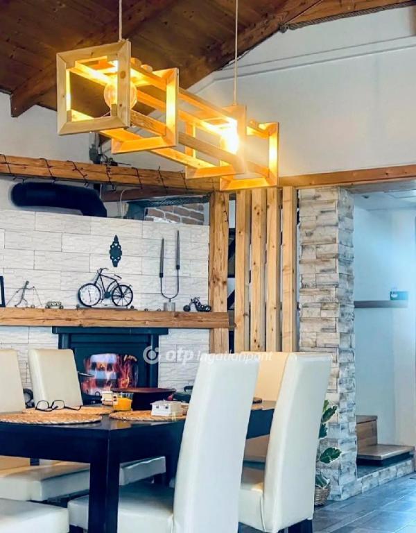 A ház különlegességét a látványos vörösfenyő tetőszerkezet, a padlófűtés, a korszerű légkondicionált fűtési rendszer, valamint a beépített kandalló adják. A tágas, 35 m2-es gépesített amerikai konyha, nappali egy légtérben található, ami ideális családi és baráti összejövetelekhez is.