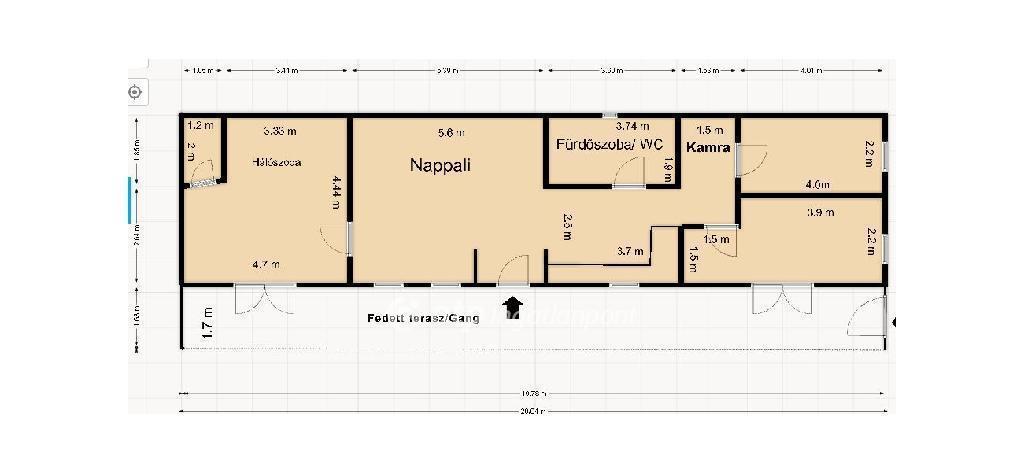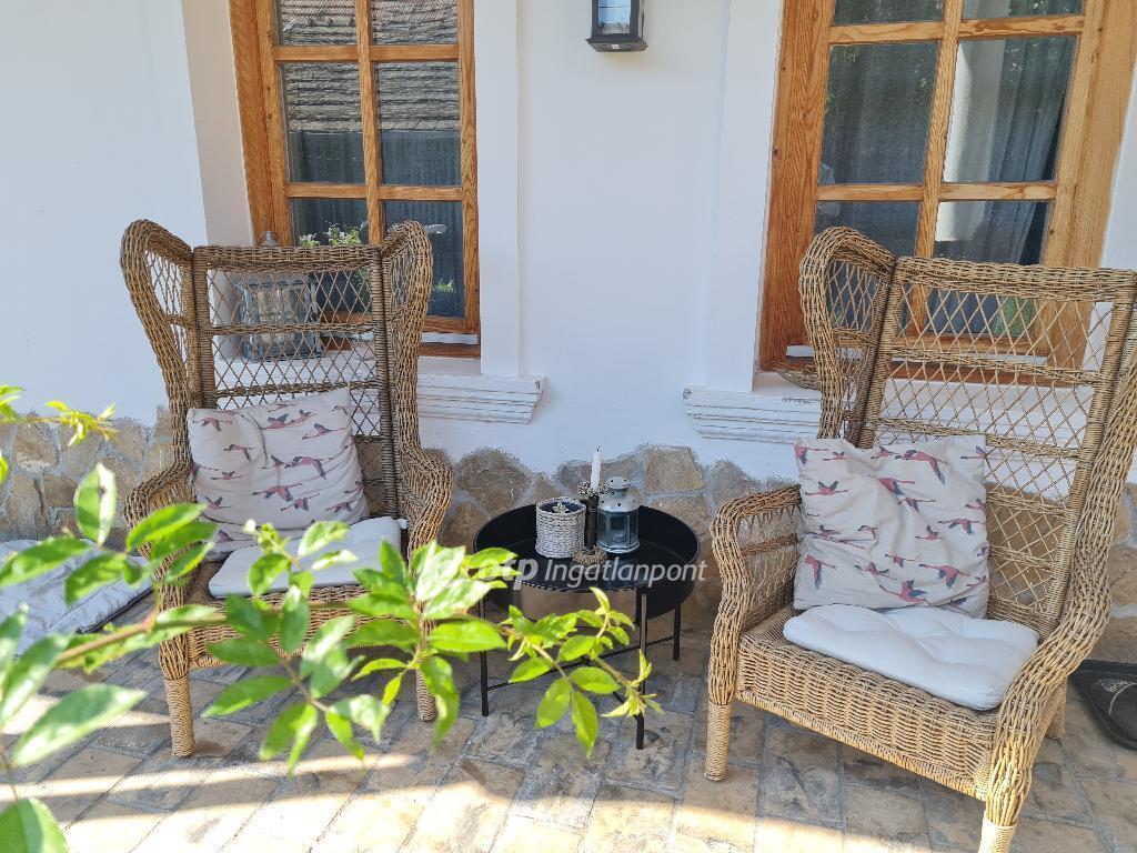 -Az épület klasszikus parasztház kialakítású, tehát a a ház hosszában fedett gang, és mellette egy szépen kialakított 20 nm-es terasz található.