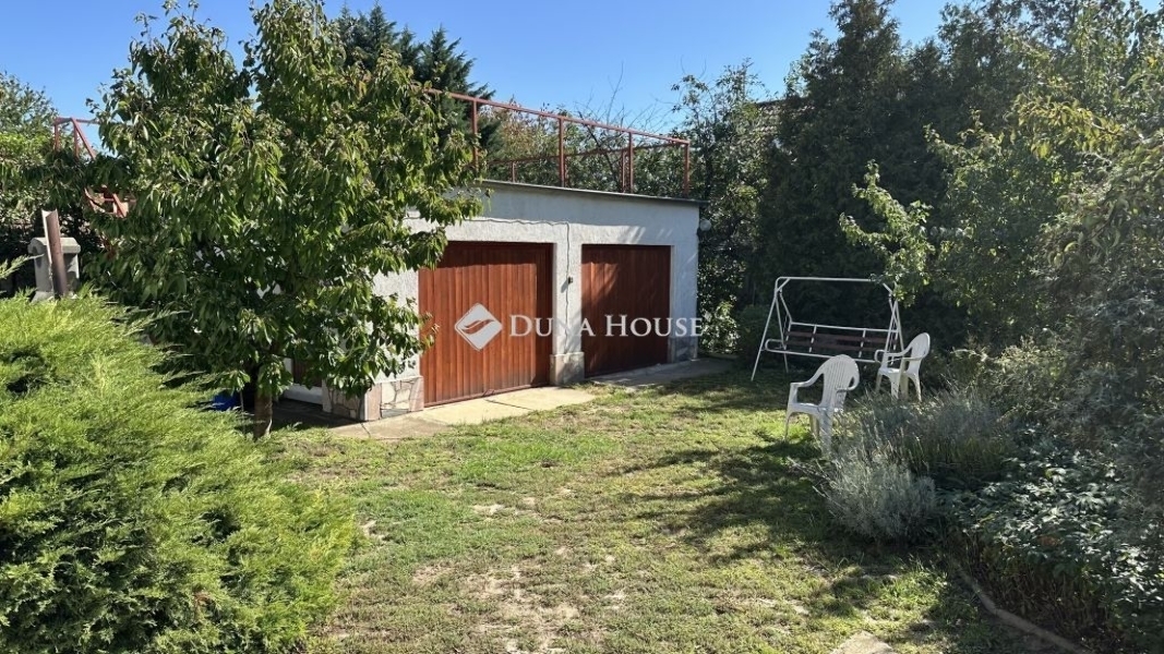 A ház mellett egy önálló kétállásos garázs is helyet kapott, melynek a tetején, egy napozó került kialakításra.