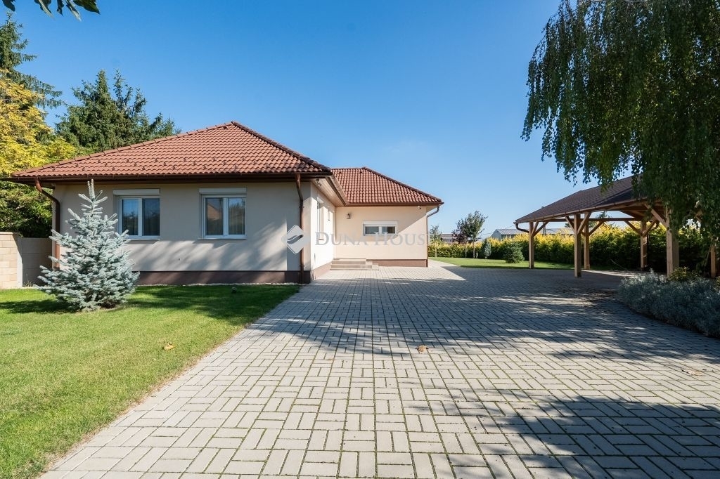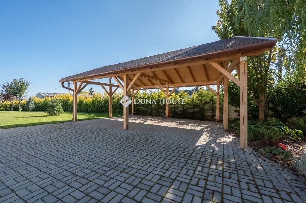 Térkövezett bejárón tudunk kényelmesen ráfordulni a fedett dupla autóbeállóra.