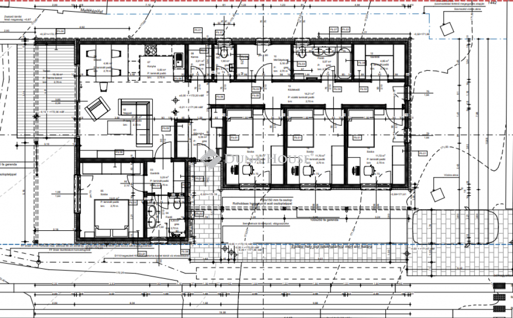 4 külön nyiló szoba, nappali, étkezős konyha, 2 fürdőszoba, külön wc, gardrób, közlekedő, gépészeti helyiség, kamra.
