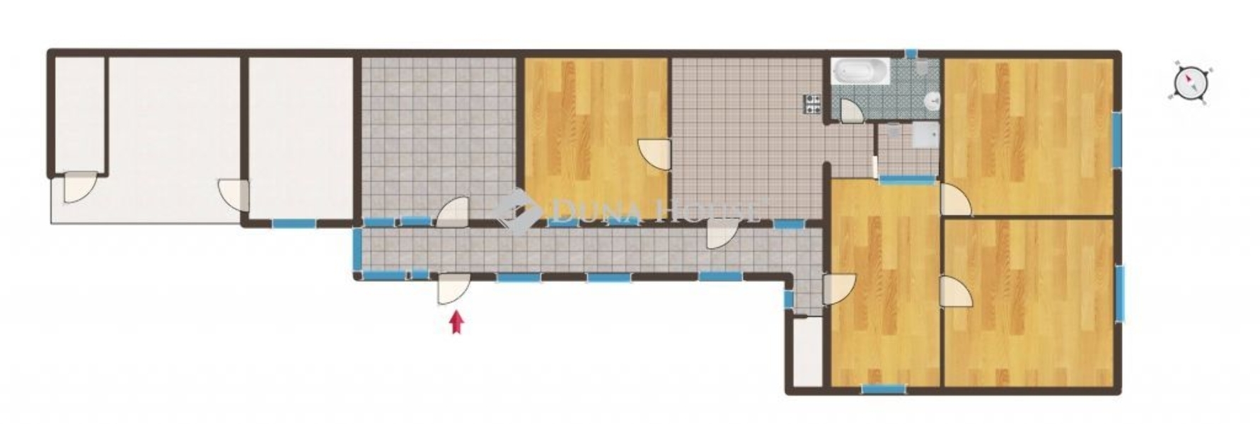 Helyiségei 3 szoba, 1 konyha, 1 kádas és 1 zuhanyzós fürdőszoba wc-vel, illetve egy nagyobb előtér. Az alapterületet az ablakokkal zárttá alakított hosszú tornác kiegészíti még egy kisebb tárolóval, illetve plusz egy szobával, ami korábban műhelyként funkcionált, így ebbe a vizet és az ipari áramot is bevezették.